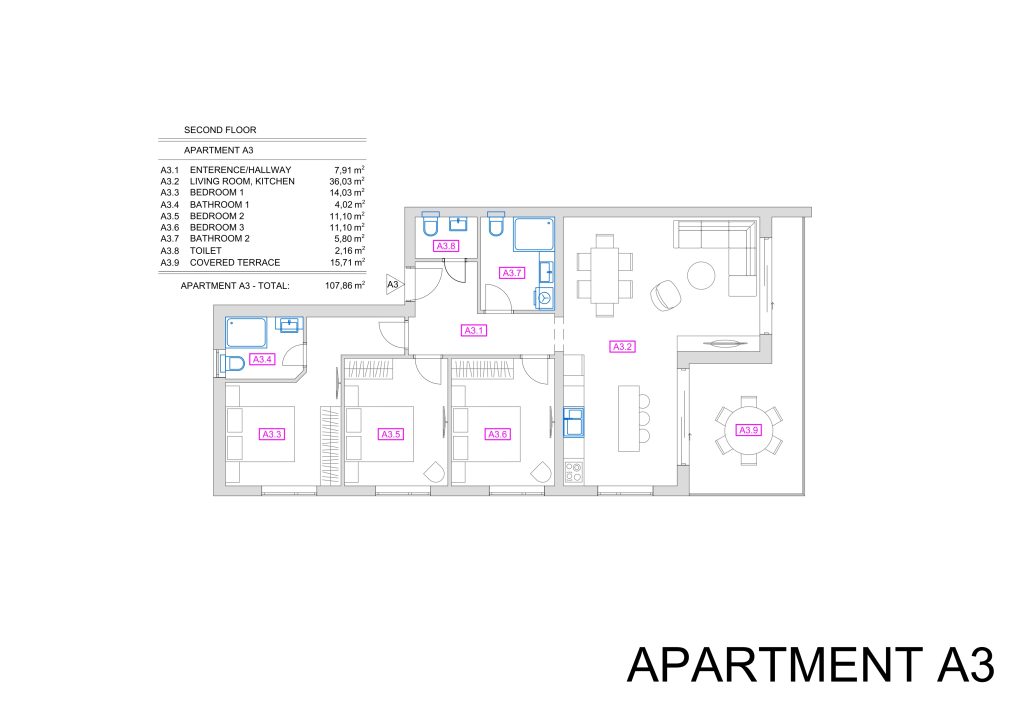 Set on the top floor, Apartment A3 offers stunning panoramic sea views from its generous balcony.